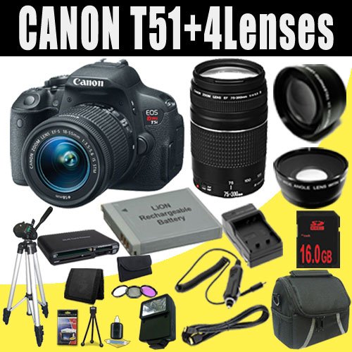 Buy Canon EOS Rebel T5i 18 MP CMOS Digital SLR Camera w/EF-S 18-55mm f/3.5-5.6 IS STM Lens EF 75-300mm f/4-5.6 III Telephoto Zoom Lens LP-E8 Replacement Lithium Ion Battery External Rapid Charger 16GB SDHC Class 10 Memory Card 58mm Wide Angle Lens 58mm 2x Telephoto Lens 58mm 3 Piece Filter Kit Mini HDMI Cable Carrying Case Full Size Tripod External Flash SDHC Card USB Reader Memory Card Wallet Deluxe Starter Kit DavisMAX Bundle Today!
