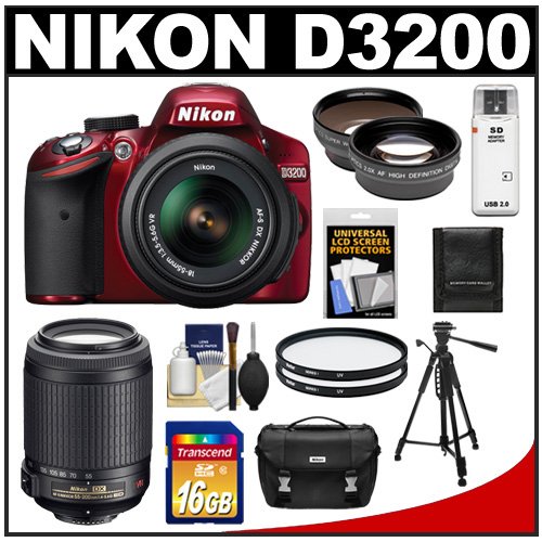 Buy Nikon D3200 Digital SLR Camera & 18-55mm G VR DX AF-S Zoom Lens (Red) 55-200mm VR Lens 16GB Card Case Filters Tripod Telephoto & Wide-Angle Lens Kit Today!