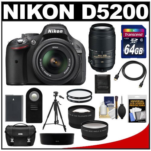 Buy Nikon D5200 Digital SLR Camera & 18-55mm G VR DX AF-S Zoom Lens (Black) with 55-300mm VR Lens 64GB Card Battery Case Tripod Tele/Wide Lenses Remote Accessory Kit Today!